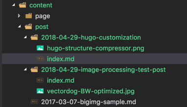 I’ve standardized on a file naming scheme of YYYY-MM-DD-post-title.md for my Hugo structure. And to help tidy things up a bit, I’ve started using Page Bundles to contain associated images, like this: